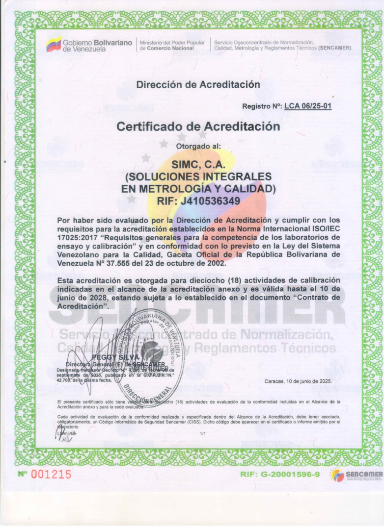 El laboratorio de calibración cuenta con un Sistema de Gestión desarrollado conforme a los requisitos de la norma internacional ISO/IEC 17025:2017. Se ofrecen diversos servicios amparados por la acreditación otorgada por SENCAMER y servicios no acreditados que son requeridos por nuestros clientes cuando no se encuentran disponibles a nivel nacional. En todos los casos SIMC, C.A. asegura el cumplimiento de los requisitos de la norma ISO/IEC 17025:2017. Nuestra premisa es que el grado de rigor aplicado es el mismo para todos nuestros servicios, siendo la competencia técnica, la imparcialidad y la operación coherente las bases que sustentan nuestro desempeño.